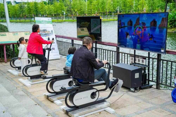 午后,市民步入“科普康养区”,体验一场科技赋能的身心焕活。几位体验者穿戴外骨骼设备,在机械动力的辅助下,原本吃力的爬坡变得轻松自如。旁边的AI运动区传来阵阵欢声笑语,一家人正在智能划船机上进行趣味竞赛,实时数据让运动变得有趣又科学。市民蔡女士笑着说:“能在这么美的环境里锻炼,感觉整个人都焕然一新了。”